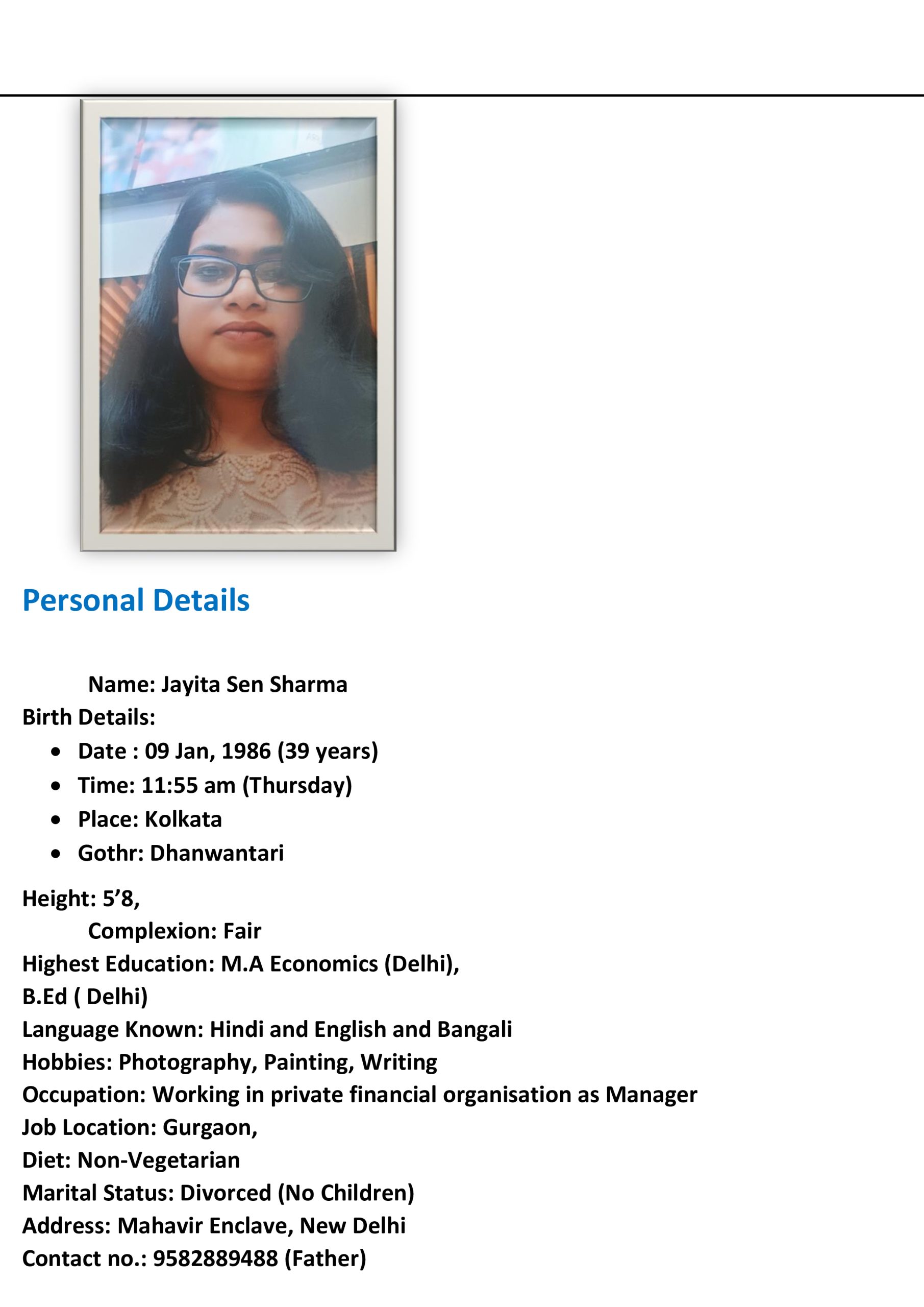 Can speak: Bengali, English, Hindi City of Birth: New Delhi